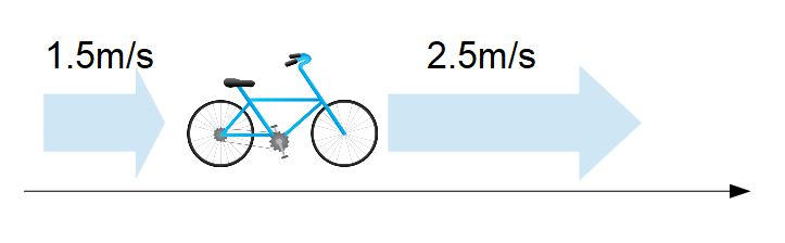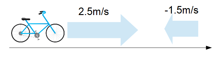 今、下図のように右向きを正として右に向かって風速1.5m/sの追い風の中を自転車がやはり右向きに2.5m/sで進んでいることを想定します。