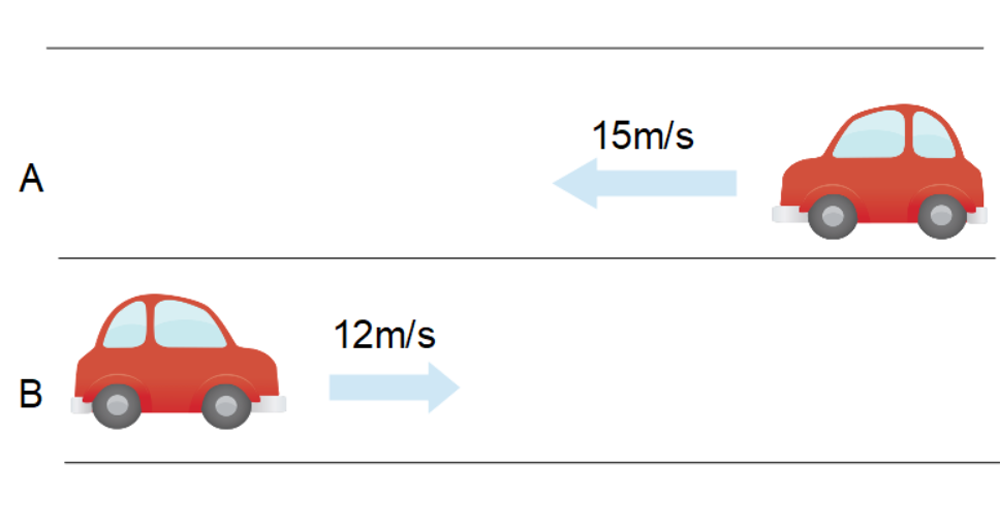 右向きを正とすると、車Aの速度は\(v_{A}=-\)15m/s、車Bの速度は\(v_{B}=\)12m/sとなります。相対速度の考え方は変わらずです。このとき、車Aに対する車Bの相対速度を計算してみましょう。