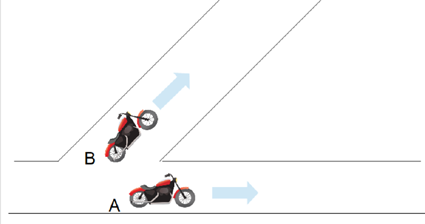 今、以下のようにバイクAは右向きに走っていて、バイクBは右斜め上に走っているとします。このとき、バイクBに対するバイクAの相対速度を作図してみましょう。