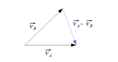 相対速度の求め方は今までと変わらず、\(\overrightarrow{v_{AB}}=\overrightarrow{v_A}-\overrightarrow{v_B}\)で求められます。これはベクトルの減法そのものの方法で、作図すると以下のようになります。