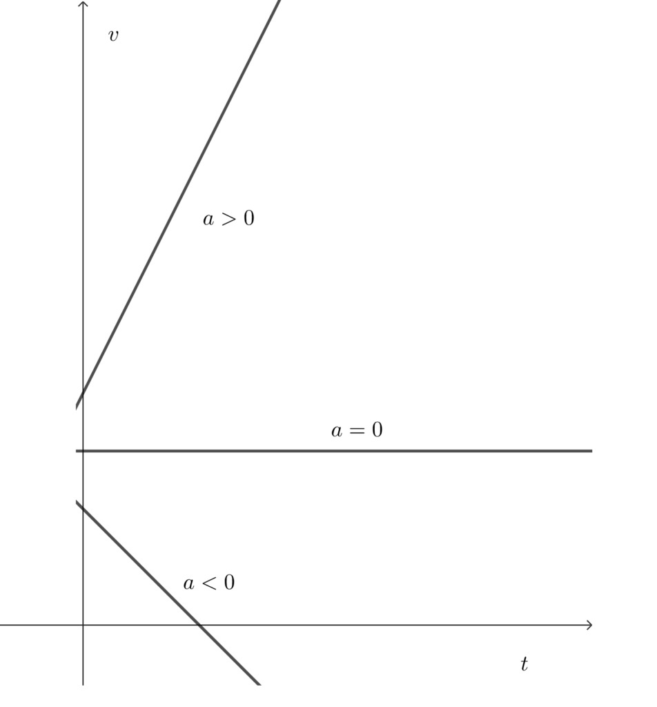 加速度がある状態での\(v-t\)グラフはどのようになるでしょうか。等速直線運動であれば傾きのない直線となります(加速度がゼロ)が、加速度が変化しない物体の運動であれば、一次関数的な直線となります。このとき、\(a>0\)であれば右上がりの直線に、\(a<0\)なら右下がりの直線となります。