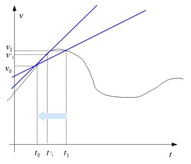 加速度も速度同様、時々刻々と変化するのが普通の自然現象です。したがって、時刻\(t_0\)から\(t_1\)での速度の変化が加速度の定義ですが、これは平均の加速度です。\(t_1\)を限りなく\(t_0\)に近づけていけば\(t_0\)における接線の傾きとなり、この傾きこそが瞬間の加速度を示します。速度同様、瞬間の加速度は \[\large{a=\lim_{\Delta t\to 0}\frac{\Delta v}{\Delta t}=\frac{dv}{dt}}\] と表されます。