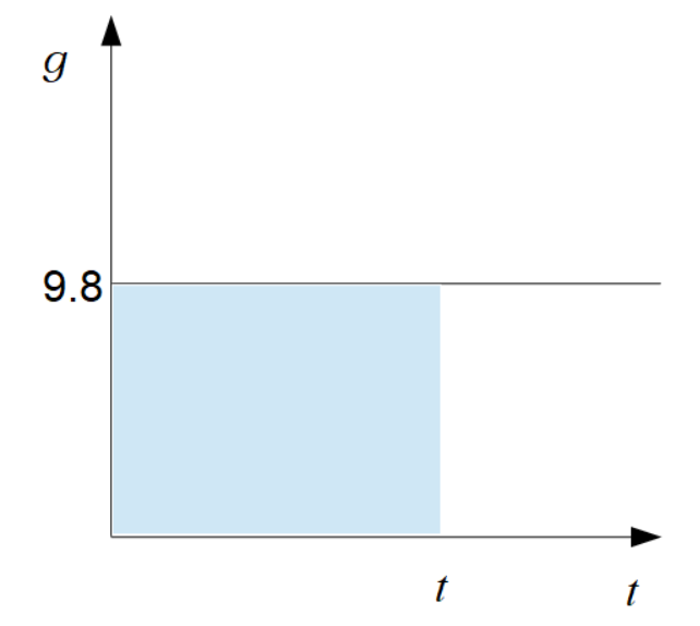 前回のおさらいですが、\(g-t\)グラフは重力加速度が一定のため、右のようなグラフとなります。ちなみにいうと、重力加速度は測定する地域によって微妙に違いますので記号\(g\)を使います。数値計算をするときにはその値が与えられています。