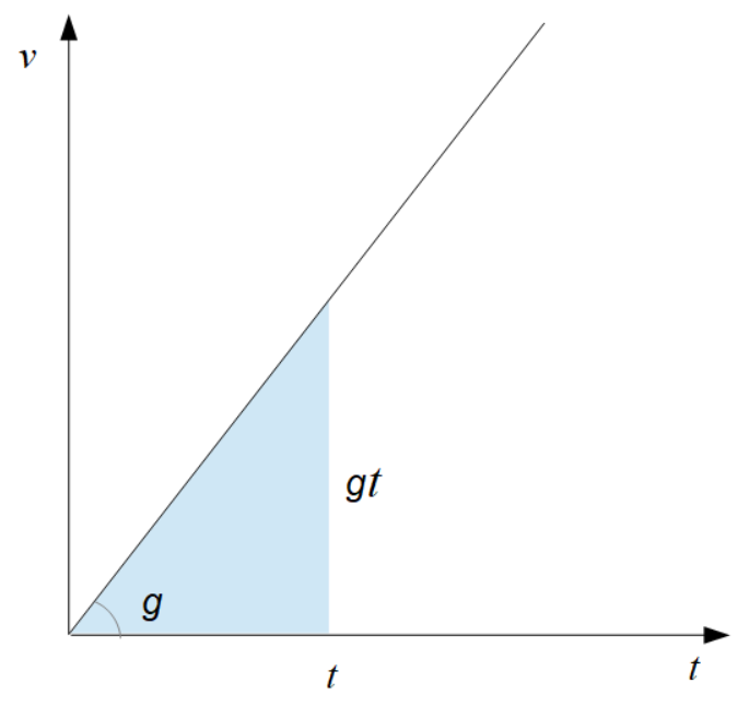 重力加速度は、時間\(t_0\)のときの速度\(v_0\)と時間\(t_1\)のときの速度\(v_1\)の変化の割合に相当します。したがって、 \[\large{g=\frac{v_1-v_0}{t_1-t_0}}\] であらわされます。\(t_0\)と\(t_1\)の差を限りなく0に近づけることによって、 \[\large{g=\frac{\Delta v}{\Delta t}}\] となり、この式を変形すれば \[\large{\Delta v=g\Delta t}\] となるから、上記\(g-t\)グラフの青い部分の面積は速度を表します。要するに \[\large{v=gt}\] の式が導かれます。