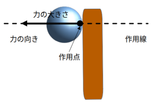 力がはたらく点(この場合、バットとボールが接触している点)を作用点といい、作用点から力の向きに力がはたらく大きさに比例して矢印を描きます。作用点を通り力の向きに引いた直線を作用線といいます。