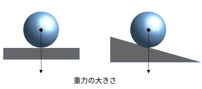 力には、いろいろな種類があります。まずは重力です。重力は地球が物体を地球の中心へ引っ張る力のことで、重力の大きさを重さと呼んでいます。重力はベクトル量であるのに対し、重さはスカラー量です。重力は物体の運動状況やその場所に関わらず常に鉛直下向きに働き、重力の大きさは物体の中心から重力の大きさだけ鉛直下向きに矢印を描くことで表します。重力の大きさは質量に重力加速度をかけたもので、重力加速度は約9.8m/s2なので、1kgの物体にかかる重力は約9.8Nとなります。