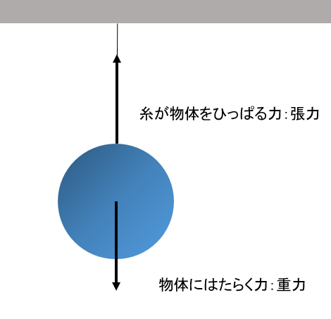 力は重力以外にもいろいろあります。まずは、物体を糸につるして張った状態で静止したとき、鉛直下向きには重力がはたらきますが、重力の作用線上に物体と糸が接触した点から上向きに力がはたらきます。これは糸が物体をひっぱる力で、張力といいます。糸がゆるんでいるときには張力は物体にははたらきません。なお、ひとつの物体が静止しているとき、重力と張力の大きさは等しくなります。
