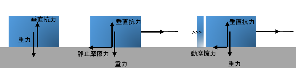 物体を水平面上に置くと静止して動きません。このとき、相変わらず鉛直下向きには重力がはたらきますが、水平面から鉛直上向きに力がはたらきます。この力を垂直抗力といいます。