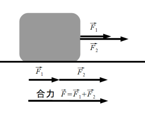 右の図のように、同一作用線上にある同じ向きの力の合成は、2つの力を足すことで合力を求めることができます。