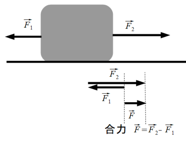 一方、同一作用線上にあっても、力の向きが逆方向にはたらいている場合は、どちらかの向きを正として考えてあげればよく、右の図のような場合、右向きを正とすれば\(-\overrightarrow{F_1},\overrightarrow{F_2}\)となるので両者の和が合力となるわけです。