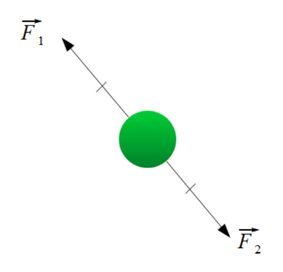 今、物体に対して、左上方向に力\(\overrightarrow{F_1}\)、右下方向に力\(\overrightarrow{F_2}\)が同じ大きさではたらいているとします。この2つの力は同一作用線上にはたらいているので、