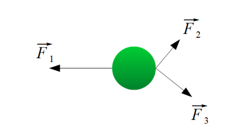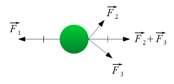このとき、右向きにはたらいている力\(\overrightarrow{F_2} ,\overrightarrow{F_3}\)の合力と、左向きの力\(\overrightarrow{F_1}\)の大きさが等しくなっていることで、力がつり合い、 物体は静止した状態となります。