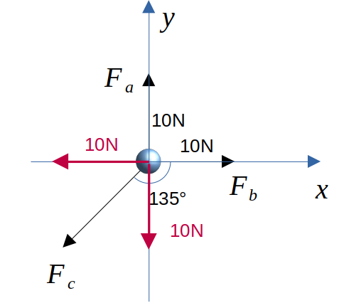 問1.物体をなめらかで水平な平面上において、\(F_a,F_b,F_c\)の方向にそれぞれ力を加えたら物体は静止した。\(F_a=F_b=10N\)のとき、\(F_c\)の方向に加えられた力の大きさを求めよ。ただし、\(\sqrt{2}=1.4\)を用いること。