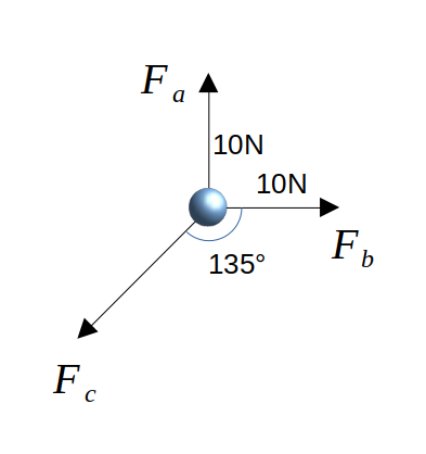 問1.物体をなめらかで水平な平面上において、\(F_a,F_b,F_c\)の方向にそれぞれ力を加えたら物体は静止した。\(F_a=F_b=10N\)のとき、\(F_c\)の方向に加えられた力の大きさを求めよ。ただし、\(\sqrt{2}=1.4\)を用いること。