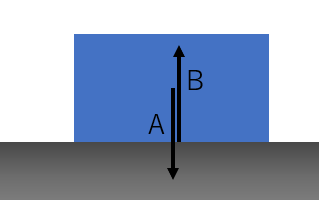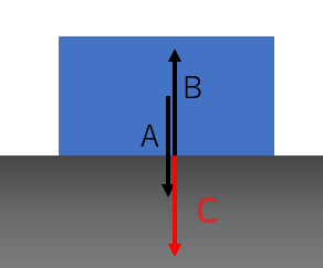 右図のように、物体が水平な地面に置かれているとき、当然物体には重力であるAが鉛直下向きにはたらきます。とりもなおさず、重力は地面(=地球)が物体を引っ張る力です。