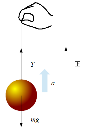 そのために、まず座標軸をとります。座標軸の取り方は自由ですが、ここでは上方に引くことから上向きを正とします。このとき、加速度は正の方向にはたらきます。