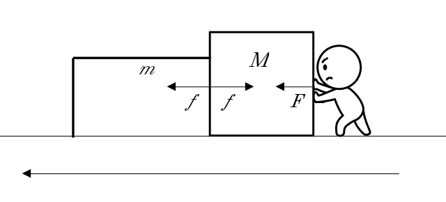 問4.なめらかな平面上に質量\(M\)の物体Aと質量\(m\)の物体Bを接するようにおいて左方向に力\(F\)で押したら一体となって運動した。このときに生じる加速度\(a\)と物体Aが物体Bを押す力\(f\)を求めよ。