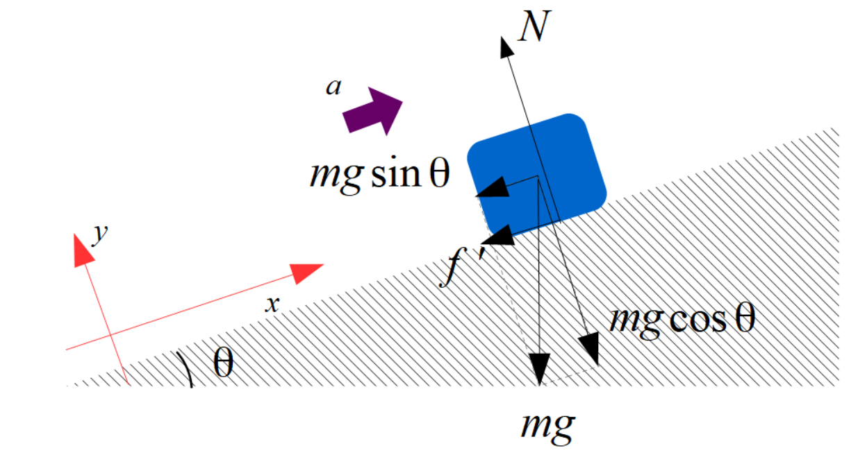 問3.水平面との角度θの傾斜のついたあらい床面に質量mの物体をおいて、斜面上方向に一定の加速度を与えた。このとき、物体にはたらく加速度の向きと加速度の大きさを求めよ。ただし、物体と床面との動摩擦係数をμ′、動摩擦力をf′、重力加速度をgとする。