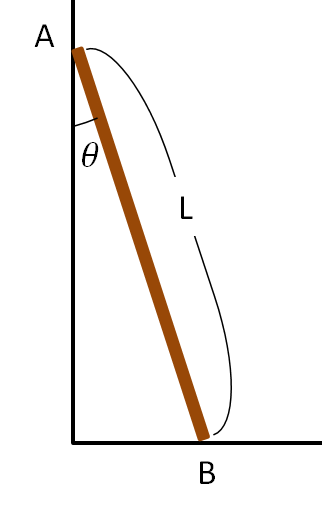 壁に立てかけた棒にはたらく力のモーメントを考えてみます。今、あらい床の上に壁に対して角度\(\theta\)で棒を立てかけたとき、棒がすべらずに静止している状況です。棒の長さを\(L\)、棒の質量を\(m\)とします。このときの床に対する摩擦力を求めていく形です。※壁に対しては摩擦力を考えないものとします。