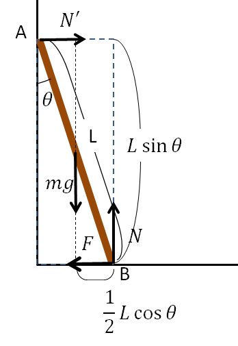 次に力のモーメントのつり合いについてみていきます。Bを回転の軸として\(N',mg\)を右図のように移動してやると、点Aにおける力のモーメントはうでの長さが\(L\sin\theta\)なので\(N'L\cos\theta\)。一方、棒の中点における力のモーメントはうでの長さが\(\dfrac{1}{2}L\cos\theta\)なので\(mg\dfrac{1}{2}L\cos\theta\)。この両者が等しいので