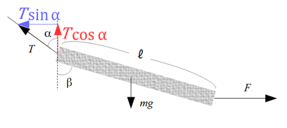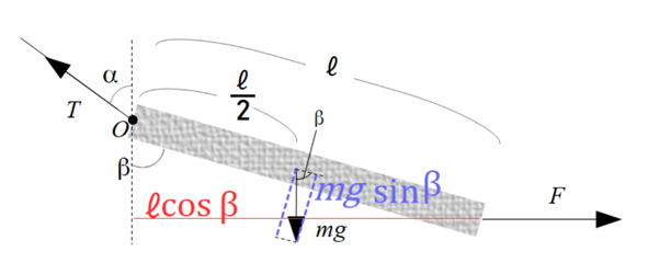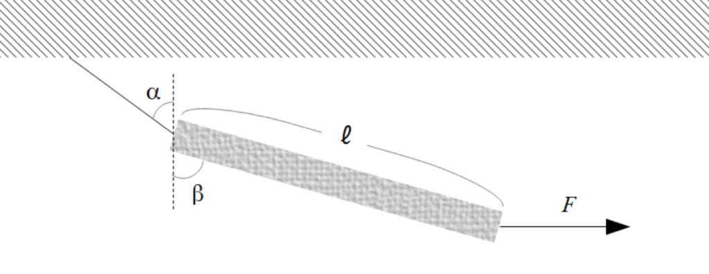 問1.質量が\(m\)、長さが\(\ell \)の一様な棒が、その一端に取り付けられた糸によって天井からつるされている。この棒のもう一端に、水平右向きに力\(F\)を与えると静止した。このとき、以下の図のように糸、および棒が鉛直方向とのなす角をそれぞれ\(\alpha,\beta\)とすると、\(\tan\beta=2\tan\alpha\)となることを示せ。ただし、重力加速度を\(g\)とする。