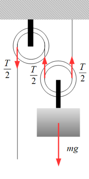 分の距離を引かなければなりません。つまり、張力そのものは定滑車の半分で済みますが、引く距離は物体を持ち上げる距離の2倍が必要ということです。このときの仕事\(W_2\)は